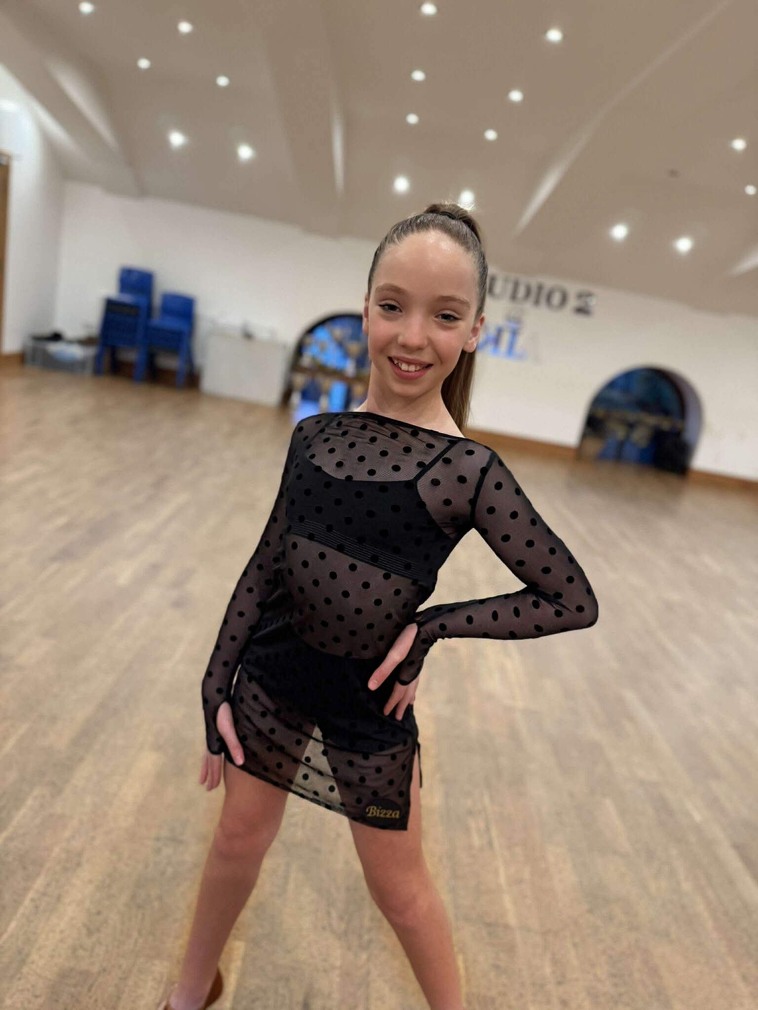 Step into confidence and style with this elegant sheer polkadot mesh practice dress. Perfect for dancers who want to make every movement look effortless, this dress combines comfort, sophistication, and playful flair — ideal for Latin or ballroom training.